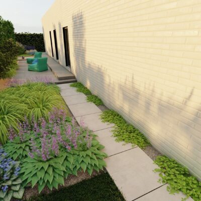 W projekcie zaplanowano żwirowe rabaty z trawami, roślinami cieniolubnymi i kwitnącymi bylinami. Wytyczono miejsce na betonowe płyty, które dodają nowoczesnego charakteru i zakątki tematyczne. Jest tutaj miejsce na grill ogrodowy, jacuzzi i piaskownicę, która przyszłości będzie służyć jako donica dla formy bonsai.