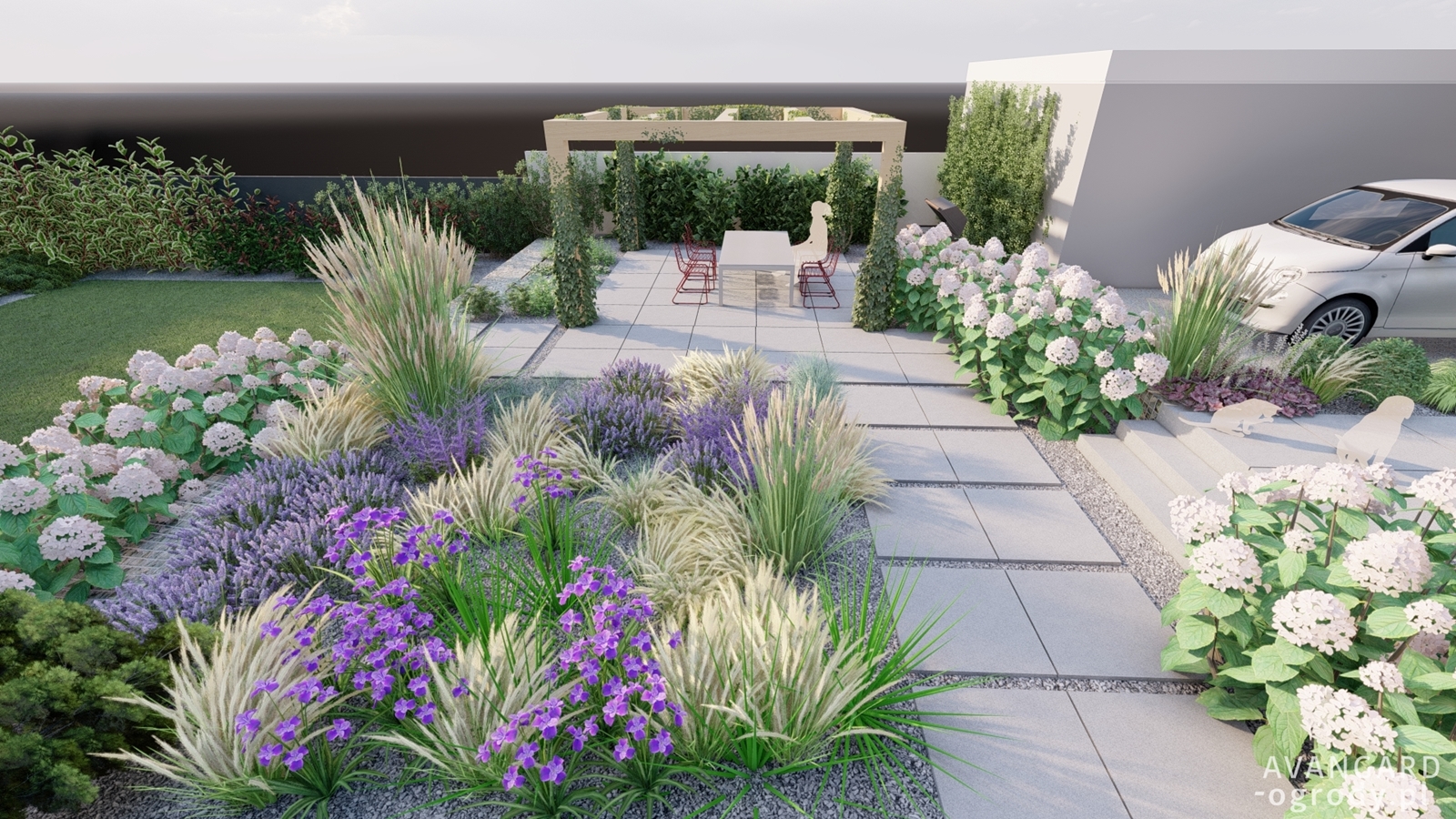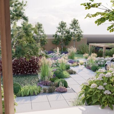 Ogród z różnymi strefami wypoczynku Koncepcja ogrodu ze strefą jacuzzi, sauną ogrodową, tarasem mniejszym na poranną kawę, tarasem do wypoczynku, tarasem do biesiadowania i strefą dla dzieci. Wszystkie miejsca zaplanowano w taki sposób, aby pozostawić przestrzeń do gry w piłkę […]